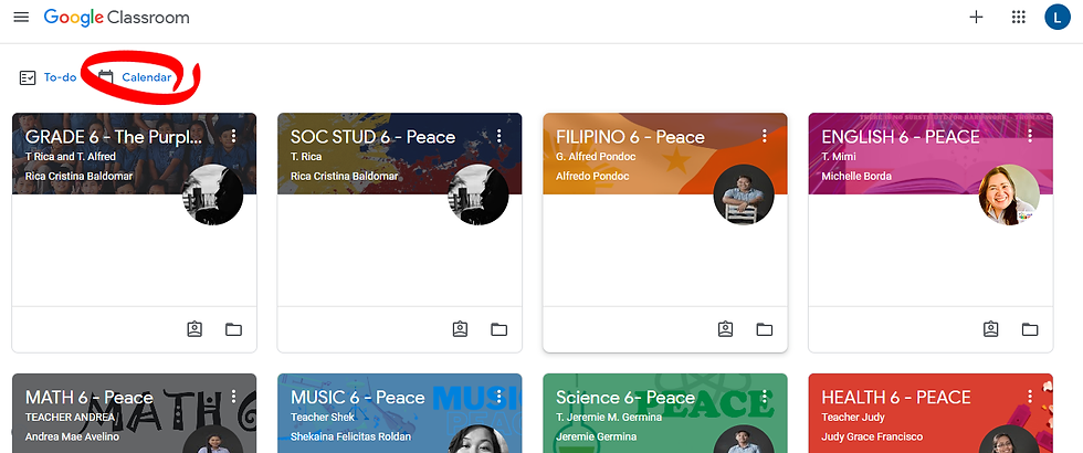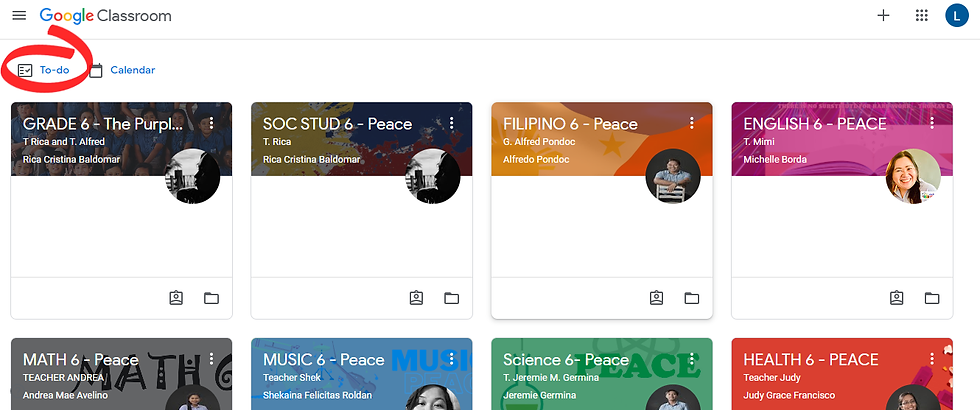 1. TO-DO AS IT APPEARS IN CLASSES - Go to Google Classroom. In the homepage, TO-DO can be seen just below the class title.